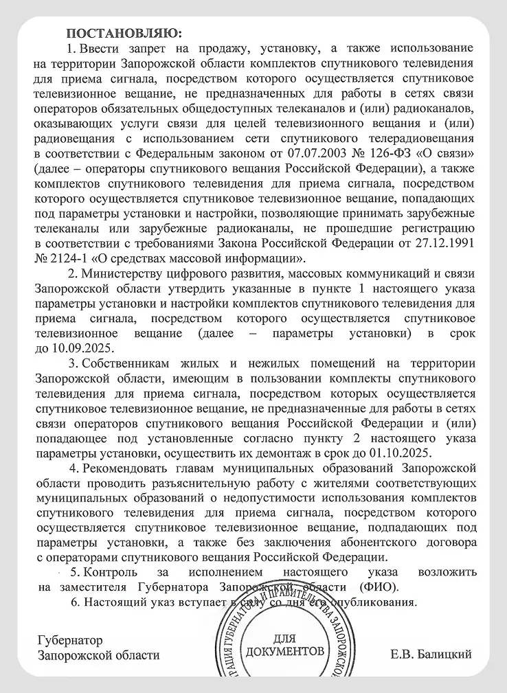 2 вересня 2025 так званий губернатор ТОТ Запорізької області Євген Балицький заборонив використання комплектів супутникового телебачення, які не працюють у мережах зв’язку російських ТБ і радіо операторів. Своє рішення він закріпив відповідною постановою. Про це «Бердянськ 24» дізнався з опублікованого наказу Балицького.