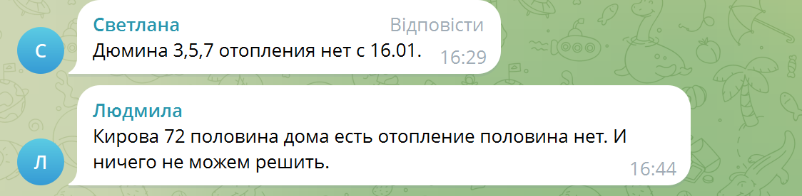 Наразі всі міські котельні працюють, однак тепло є не в усіх домівках. Біля будинку культури «Нафтохімік» у мікрорайоні Колонія замерзла наземна ділянка теплотраси. Через це без опалення залишаються 32 житлових будинки. Про це «Бердянськ 24» дізнався з публікації в тг-каналі гауляйтера Євгена Балицького.