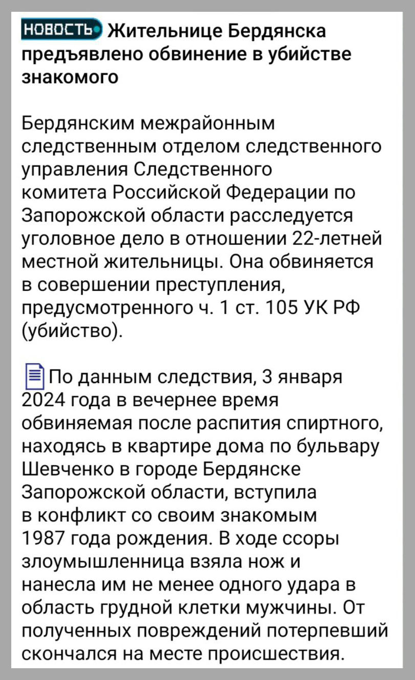 3-го січня місцева мешканка ударом ножем в груди вбила свого знайомого 1987-року народження. Про це "Бердянськ 24" стало відомо з публікації місцевих Z-пабліків з посиланням на "правоохоронні органи"