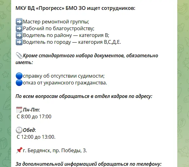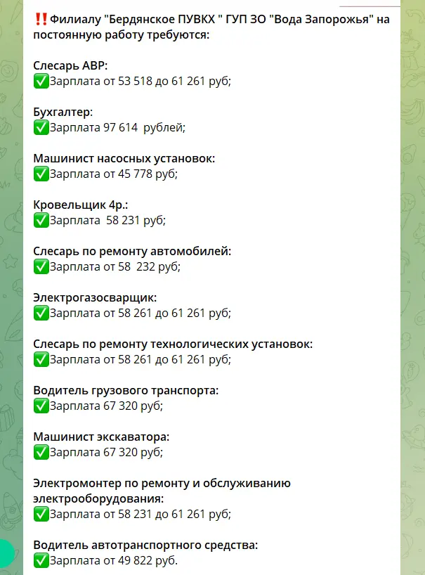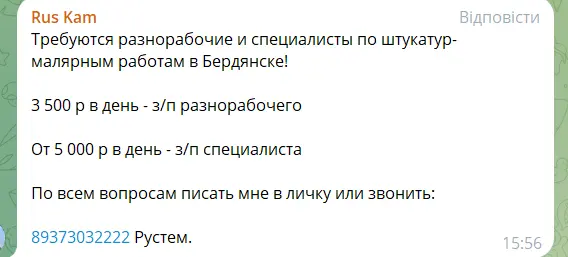 Наразі адміністрація окупантів у Бердянську шукає спеціалістів. Кандидатам обіцяють 33 дні відпустки, лікарняні та стабільну зарплату. У відділі будівництва від 35 до 60 тисяч російських рублів, в юридичному відділі до 100 тисяч на місяць.