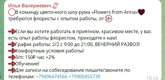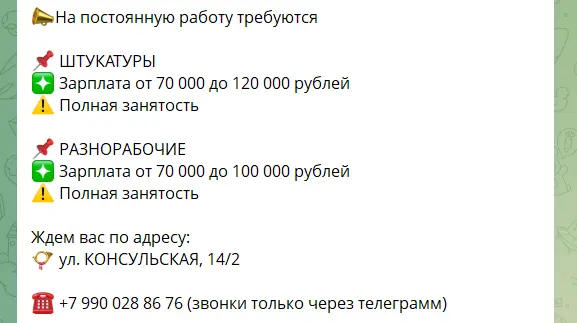 У Телеграм-каналі “Работа в Волновахе” з серпня по вересень 2025 було розміщено понад 150 вакансій з різних сфер діяльності. Попри назву каналу, жодна з вакансій не вказує конкретно Волноваху як місце роботи — найближчі до міста вакансії позначені як “із міста Донецьк”. Близько 50 пропозицій передбачають віддалену роботу, решта — вахтовий метод в інших регіонах або роботу в Донецькій області. Зарплати коливаються від 15 тисяч рублів (7,5 тис. грн) для асистентів до 250 тисяч (175 тис грн) – для стоматологів та керівників проєктів.