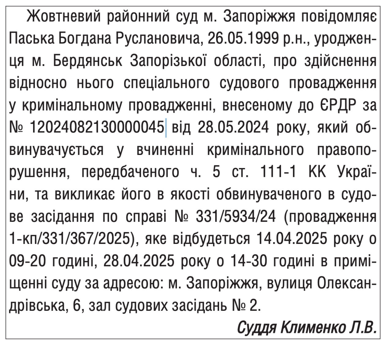 Олександрівський районний суд Запоріжжя визнав Паська винним в колабораційній діяльності. Після затримання на нього чекає 10 років позбавлення волі з конфіскацією майна. Наступні 13 років він не права обіймати посади в органах державної влади, місцевого самоврядування та надання.