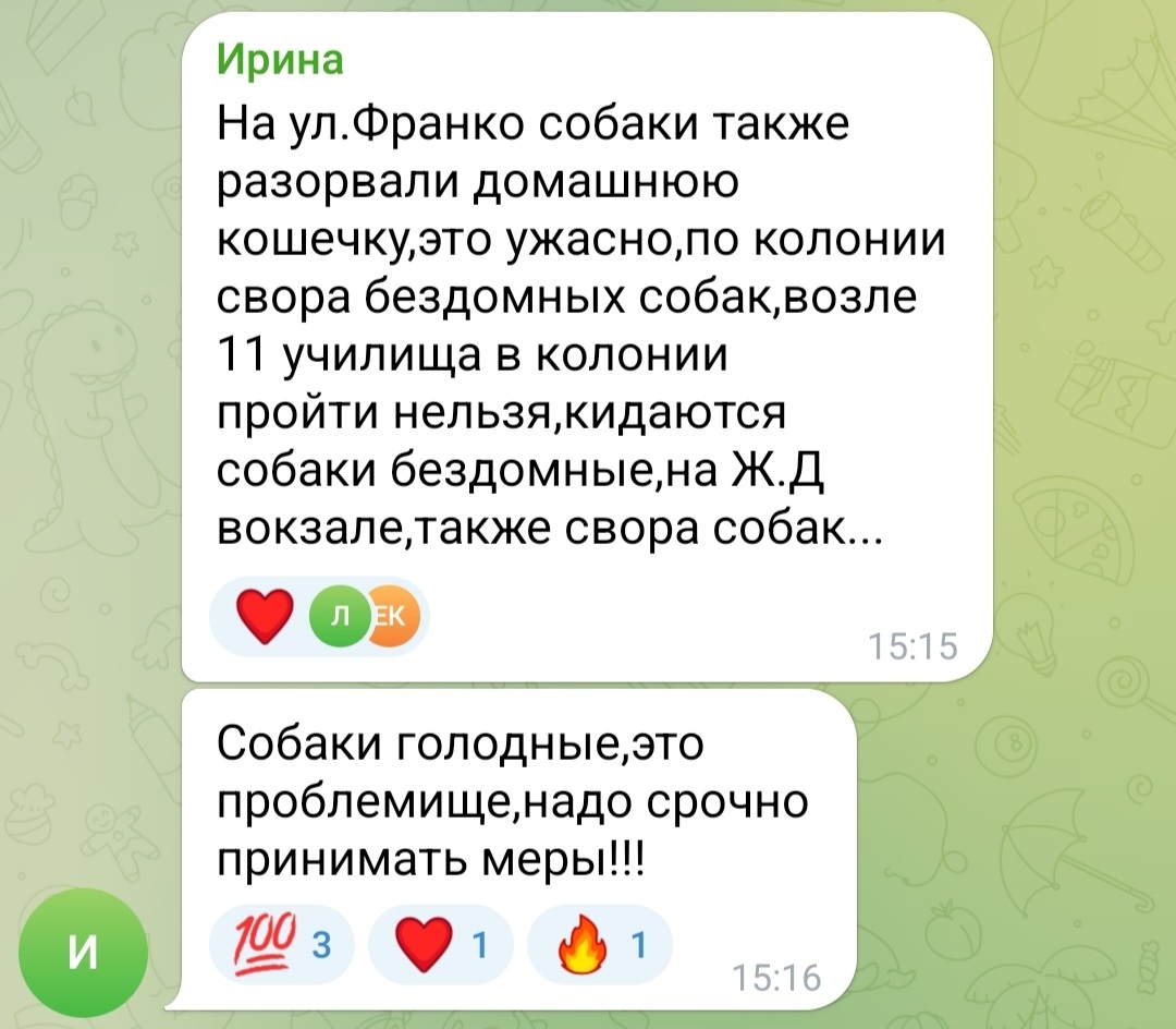 «На вул. Франка собаки також розірвали домашню кішечку, це жахливо, по Колонії зграя бездомних собак, біля 11 училища в Колонії пройти неможна, кидаються собаки бездомні, на ЖД вокзалі також зграя собак», – додає Ірина.
